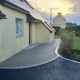 Pose de bordures type P1 pour le pourtour de la cour, installation de caniveaux à grille fonte classe B125 pour l’évacuation des eaux pluviales, et réalisation d’enrobés 0/10 noir.