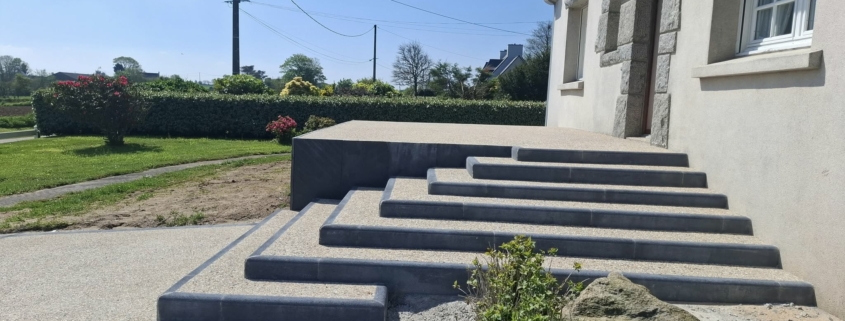 Création d’une terrasse, ainsi d’un escalier en béton lavé, avec une pose de paillis d’ardoise calices, de bordures types P1 gris anthracite, et de chaînettes de pavés gris anthracite à Bourg Blanc, malgré une petite galère avec un chien intrus qui a voulu essayer l’escalier et la terrasse trop vite, la finition reste nickel